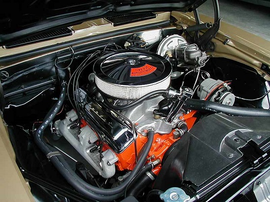 Performance parts included forged steel crank and rods, 11:1 pistons, 4-barrel carb, aluminum intake manifold, and dual snorkel chrome plated air cleaner. Cylinder heads were fitted with large 2.02" intake valves. Dual exhaust was standard.