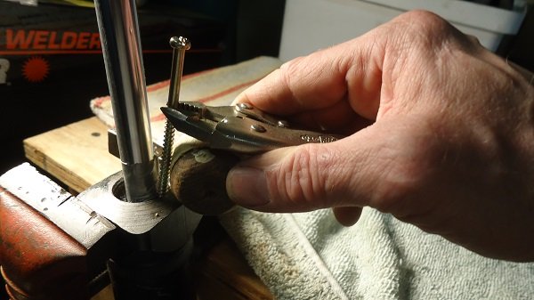 Place the cylinder upright in a vise as shown in the picture above. With a pair of internal snap-ring pliers and a small flat-blade screwdriver, remove the snap-ring and set aside.